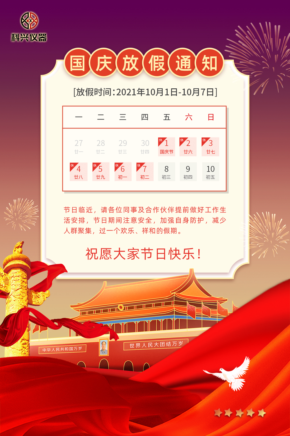 您好!感謝大家一直以來(lái)對(duì)上海科興儀器的信任和支持,在國(guó)慶節(jié)來(lái)臨之際,我司決定于10月1日至10月7日放假7天,10月8日起恢復(fù)正常工作,給您帶來(lái)的不便敬請(qǐng)諒解,謝謝合作!