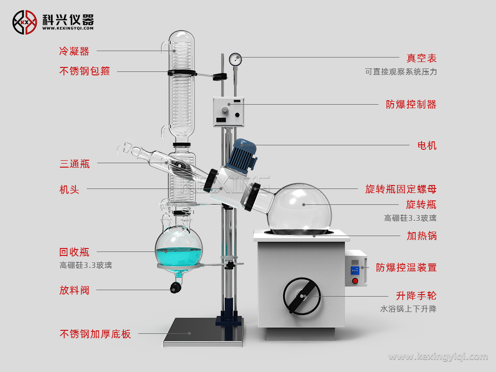 大型旋轉蒸發儀用途特點:大容量、大口徑旋轉蒸發瓶,蒸發面積大,減壓置于水浴中,邊旋轉邊加熱,使溶液高效擴散蒸發,可用于生物、醫藥、化工、食品等領域的小試、中試。